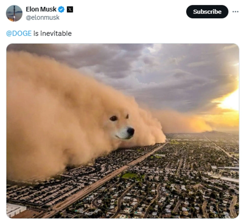 Elon Musk, the CEO of Tesla, posted on his X (formerly Twitter) on the 25th (local time) a picture of a Shiba Inu dog wearing a mask along with the phrase "Dogecoin (DOGE) is inevitable."