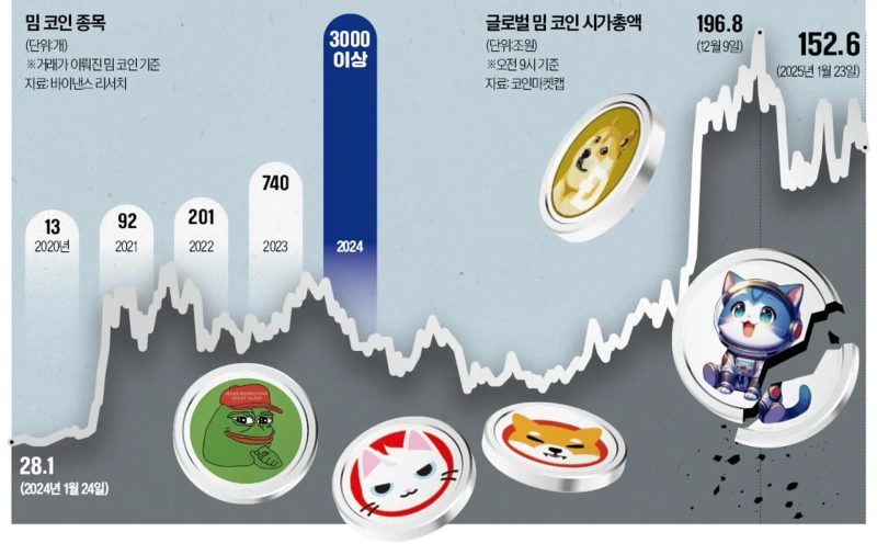According to CoinMarketCap on the 23rd, the market cap of meme coins listed on global cryptocurrency exchanges was tallied at 152.58 trillion won as of 9 a.m. that day. Compared to January 24 last year (28.13 trillion won), the market cap increased by 442.4% in one year. During the same period, the global meme coin trading volume (24-hour basis) swelled from 2 trillion won to 27 trillion won.