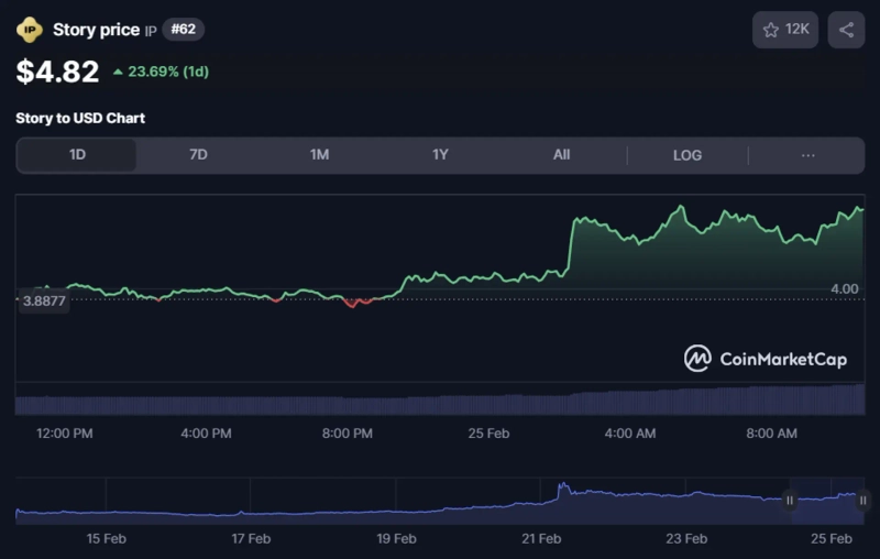- Currently, Story's price is recorded at $4.82, surpassing Maker (MKR) and Stacks (STX) to reach 62nd in market capitalization.