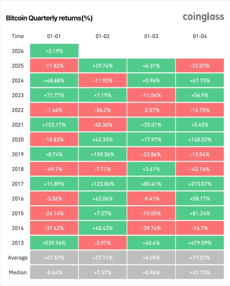 According to CoinGlass on the 1st (local time), Bitcoin’s Q4 return last year was tallied at -23.07%. It marked the first negative reading in three years since 2022 (-14.75%). In terms of the magnitude of the decline, it was the steepest in seven years since Q4 2018 (-42.16%).